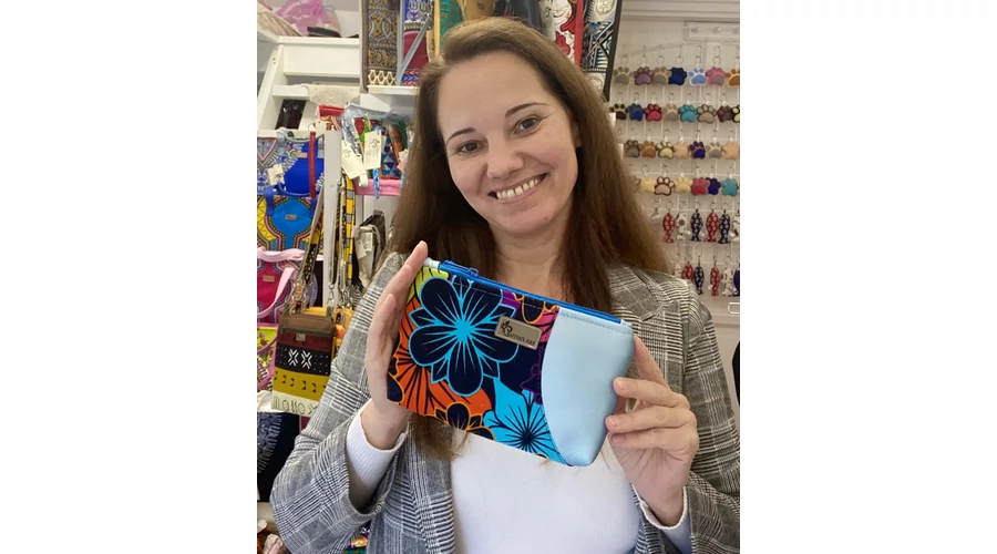 Metál világoskék vegán bőrrel kombináltam, ez tökéletesen kiemeli az afrikai anyag színvilágát. Öko tex minősítésű pamutvászonnal béleltem.