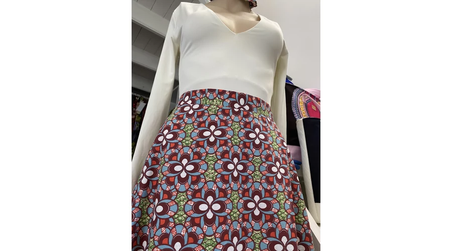 A szoknya fix derekú, hátul rejtett cipzárral záródik. Dereka 92 cm, csípőbősége maximum 120 cm.