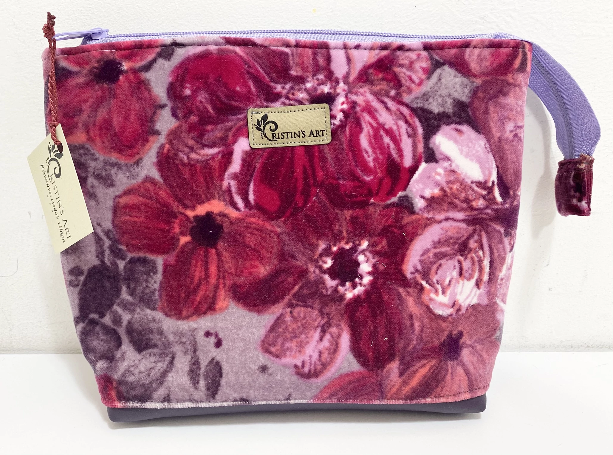 A tükörbársony anyagot egy nagyon finom, puha, sötétlila színű soft textilbőrrel kombináltam, ezzel növelve az elegáns, luxus hatást! Bélése lila selyem.