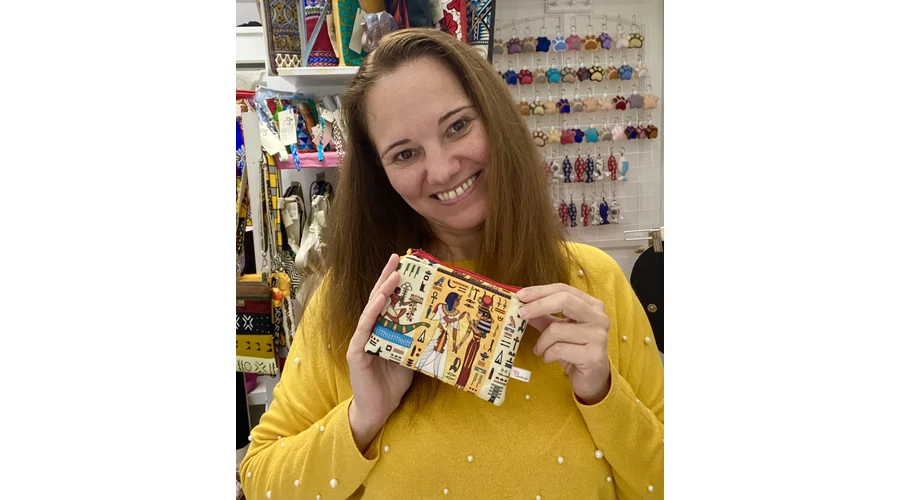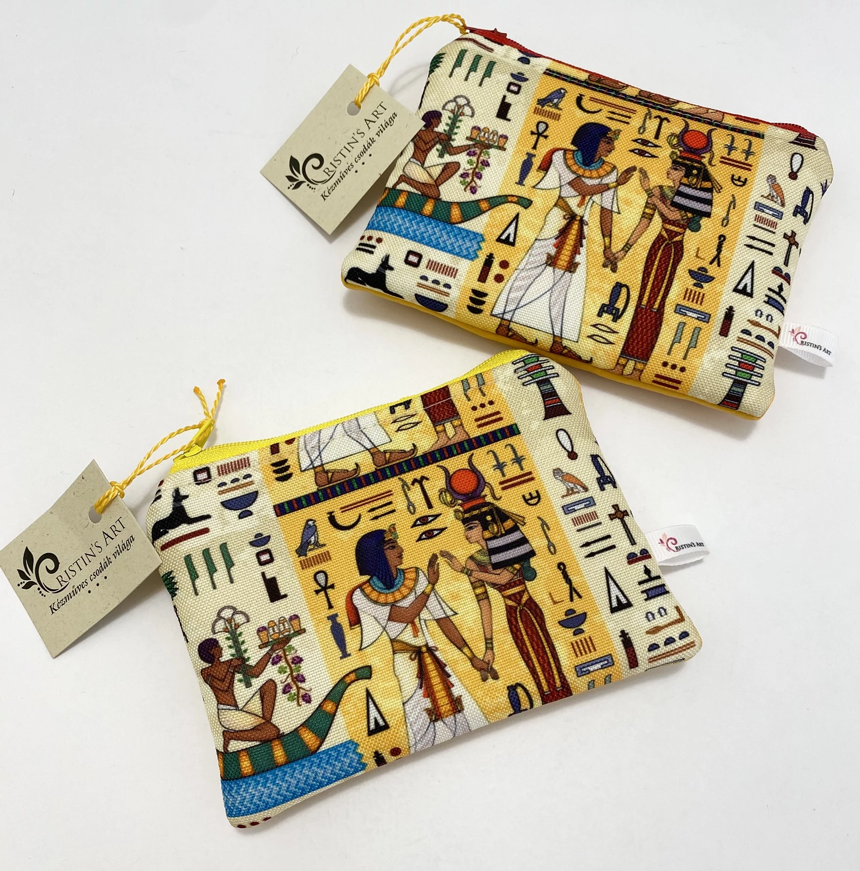 Egyiptomi mintás, hieroglifás vízlepergető cordurát és sárga textilbőr szerelme ez a kis méretű neszeszer.