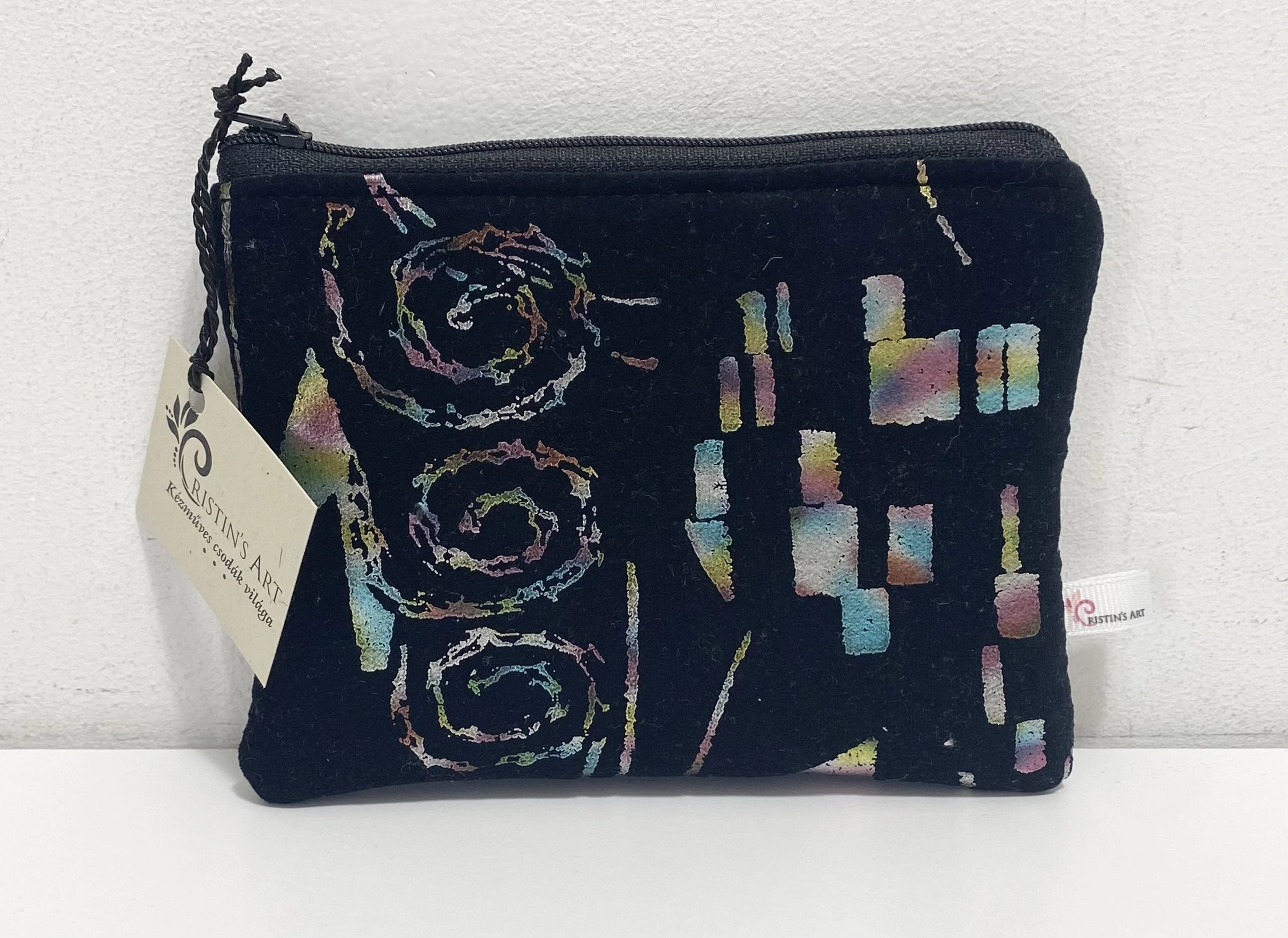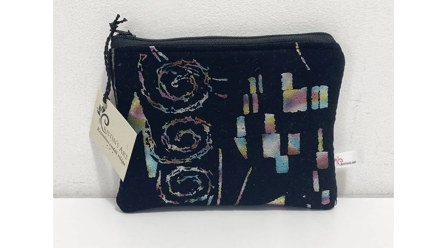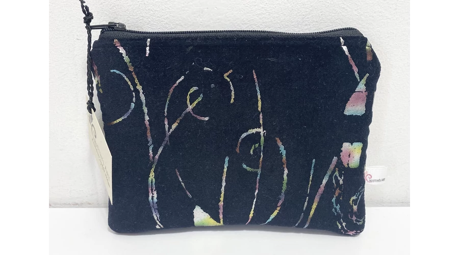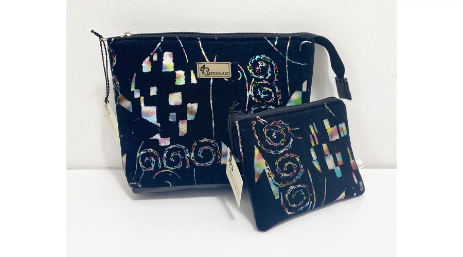 Kis méretű neszeszer elegáns fekete tükörbársonnyal, aminek a felületét fényes, színjátszó csillogós nyomat díszíti.