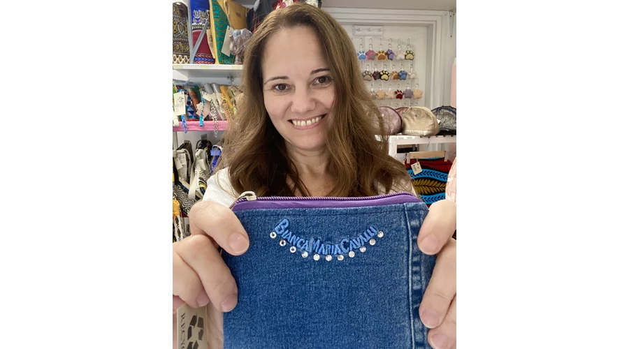 Ezt a terméket még különlegesebbé teszi a farmeren látható hímzés. Ez a hímzés egy olasz designer saját márkaneve, amit strasszkövekkel egészített ki. A hímzés a farmer nadrág csípő részénél volt, ezt használtam fel ehhez a neszihez. A bélés anyaga újrahasznosított vászon.
