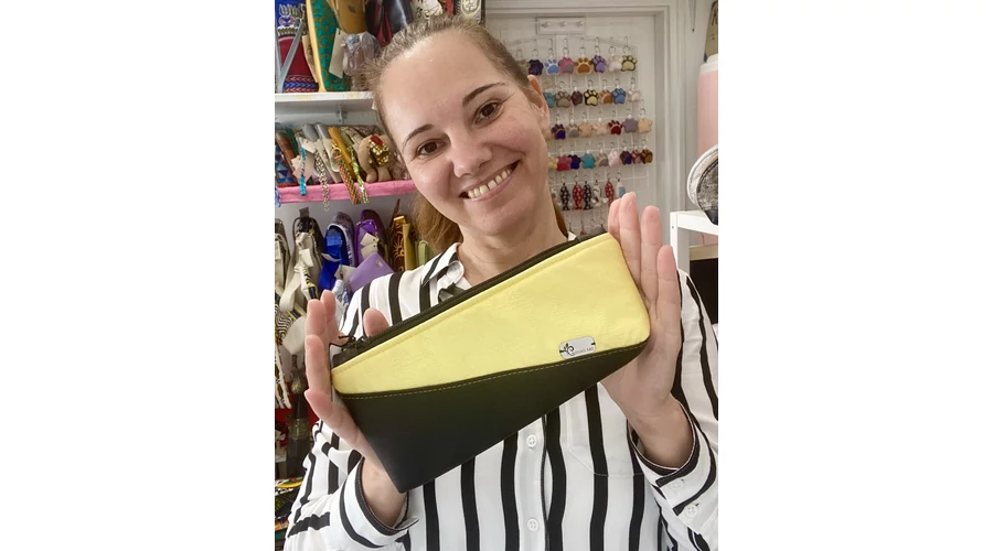 Elefántcsontpartról származó, anyagában nyomott mintás fényes sárga, bazin nevezetű vászonból készítettem ezt az egyedi, ferde, maradékmentes neszeszert.