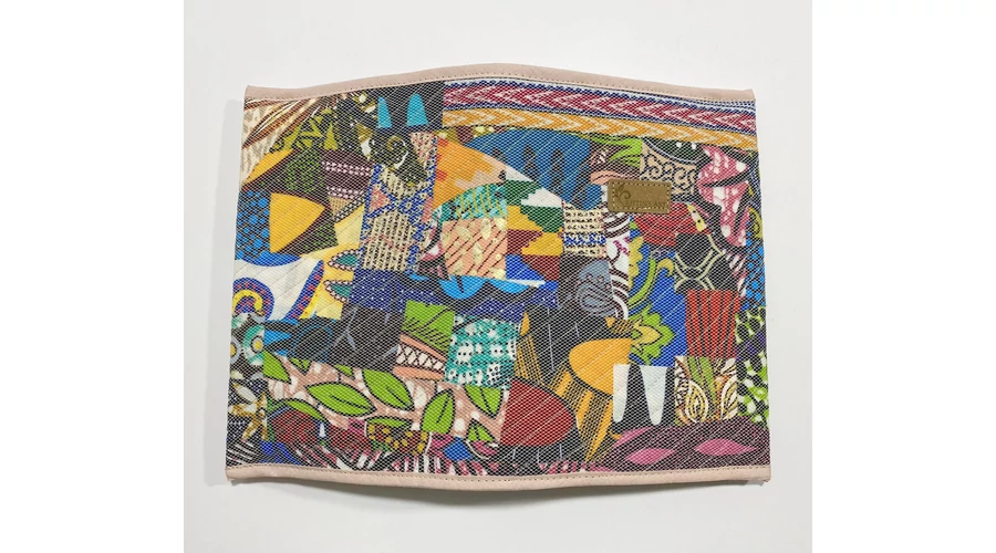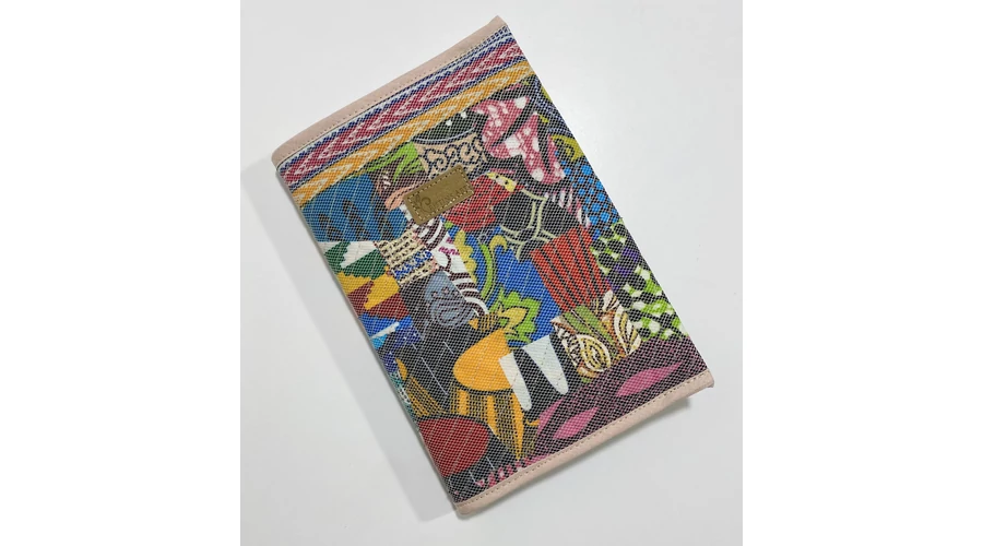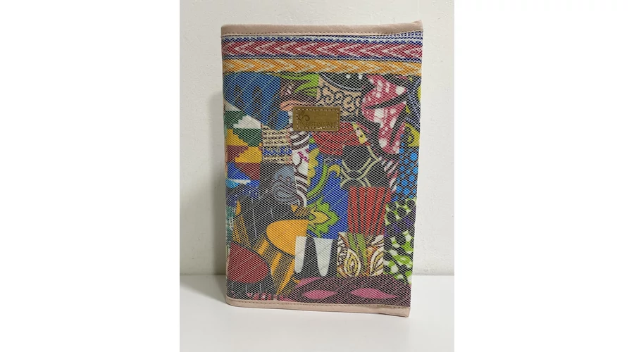 Ehhez a noteszborítóhoz az afrikai anyagok legkisebb maradékait használtam fel, ügyelve arra, hogy a minták és a színek harmonizáljanak egymással! Az apró anyagok rögzítését egy hálós anyaggal oldottam meg, amit sűrűn lesteppeltem.