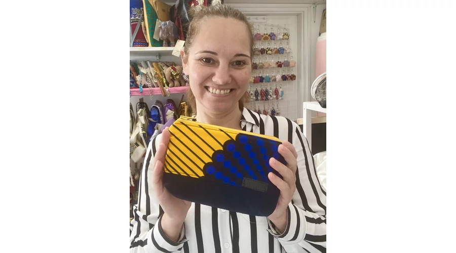 Elefántcsontpartról származó, sárga-sötétkék mintás vászonból készítettem ezt az egyedi neszeszert.