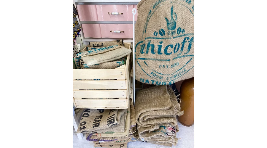 Etiópiából, szövött zsákokban érkezik a kiváló minőségű kávébab az Ethicoffee üzletébe. Ők a kávé forgalmazásával foglalkoznak, én pedig megvásároltam pár darab nagyon egyedi kiürült zsákot Tőlük!