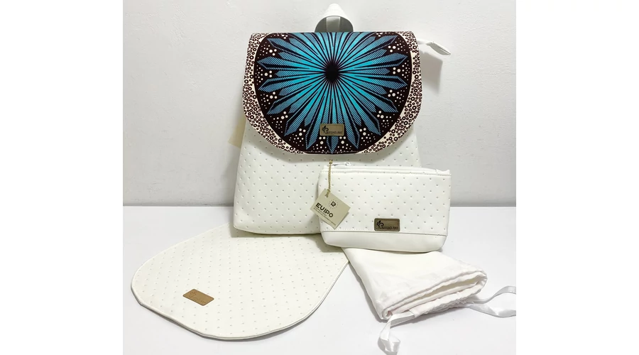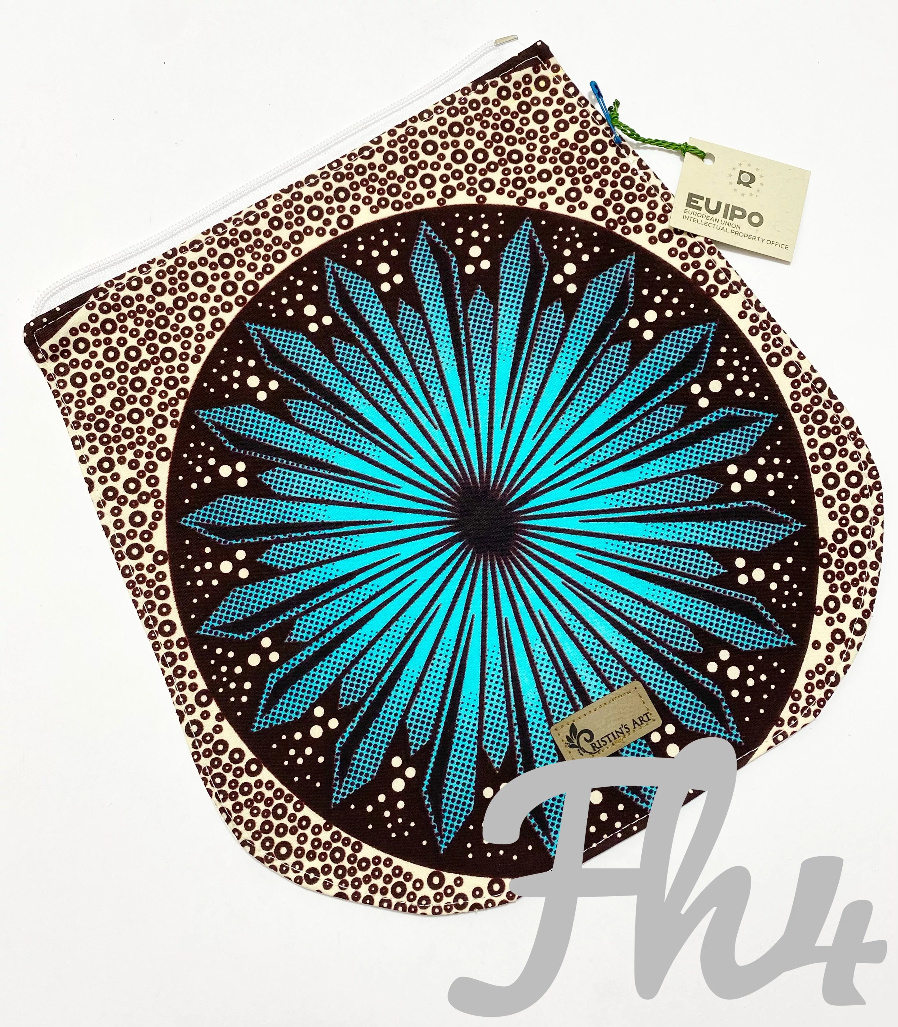 Türkiz mandalás-virág mintás afrikai pamutvászonból készítettem, melynek alja fehér textilbőr, így elsősorban a fehér hátitáska szetthez ajánlom!